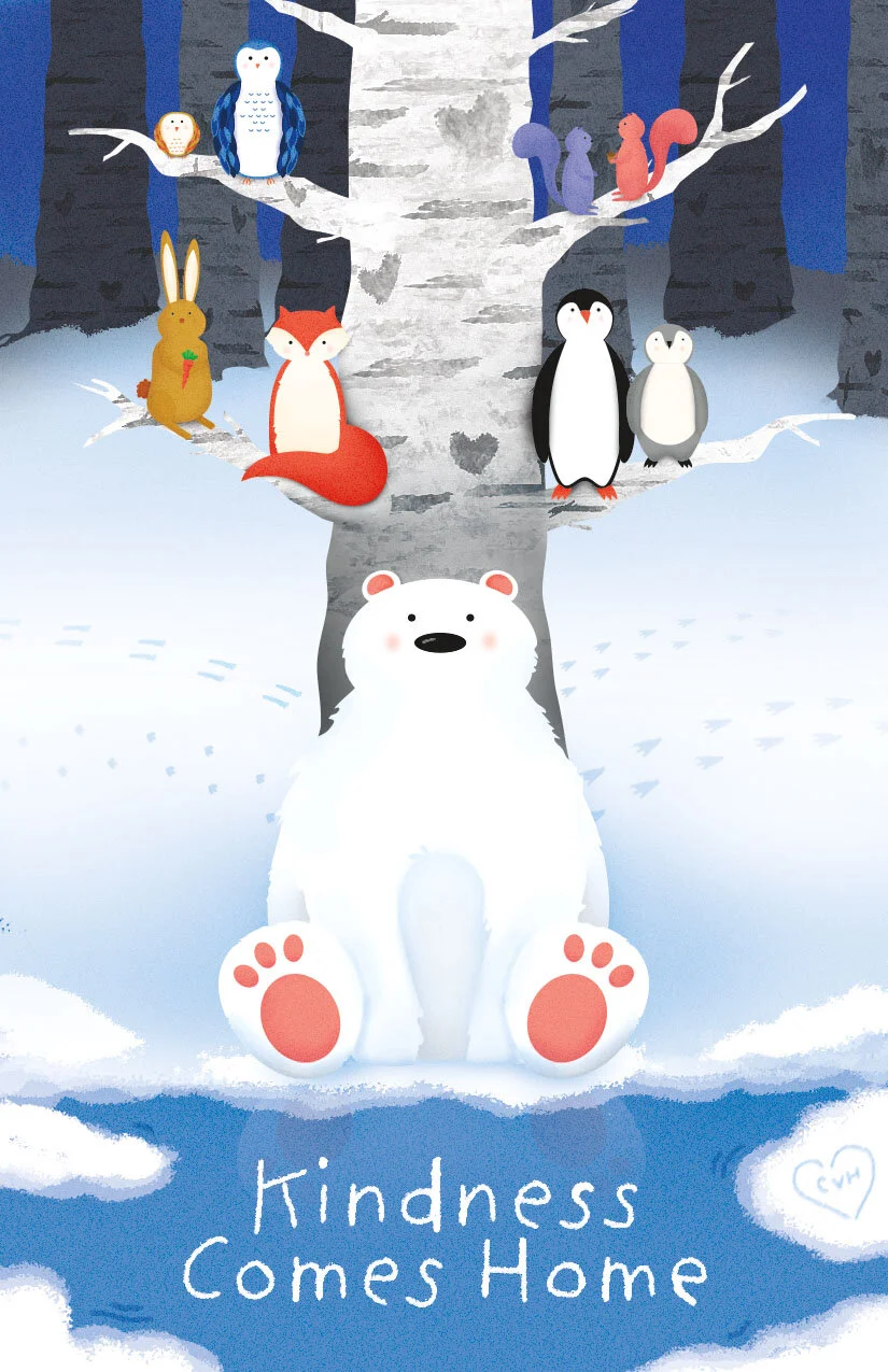 Because the theme of the gala this year was based on this family tradition of gathering these birch tree branches, I really wanted to have a birch tree be an important component in the illustration. The birch tree acts as the central element that calls all of the animals together and is a place where they can call home. I wanted to illustrate an abundance of animals and show that although they may be different, they can still come together and show kindness to one another. Because the gala took place in the winter months I not only wanted to include common animals found in the forest, such as squirrels, a fox, birds, and a rabbit, but show penguins and a polar bear too.